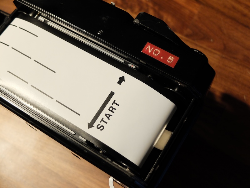 フィルムの装填はスタートマーク式。赤点の位置にフィルムのスタートを合わせて、あとはカウンターが1になるまで巻き上げるだけ。